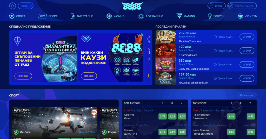 При проучването ни открихме, че не е нужно да се ограничавате само до залози на казино игри. 8888 BG е място, където залозите на спорт също са налични. Тези от вас, които са фенове на футбол, волейбол, тенис, бокс или други дисциплини, могат да поставят реални парични залози. Вие избирате с колко пари да играете и какъв тип залог да поставите.